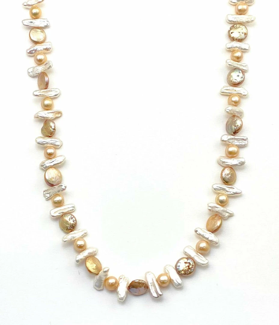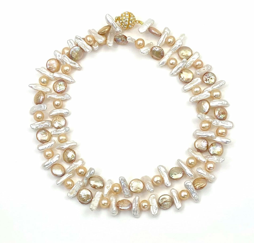 White Biwa fresh water pearls and gold round fresh water pearls coming together with a gold plated cubic zirconia ball clasp. Can be worn long or short. 35”