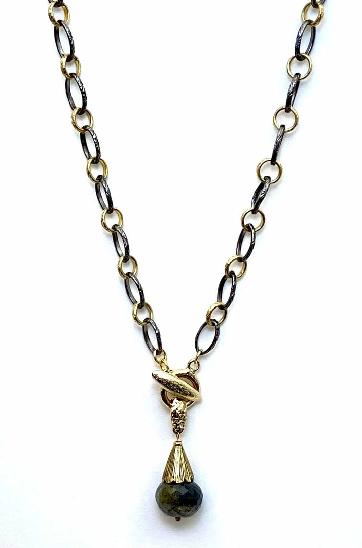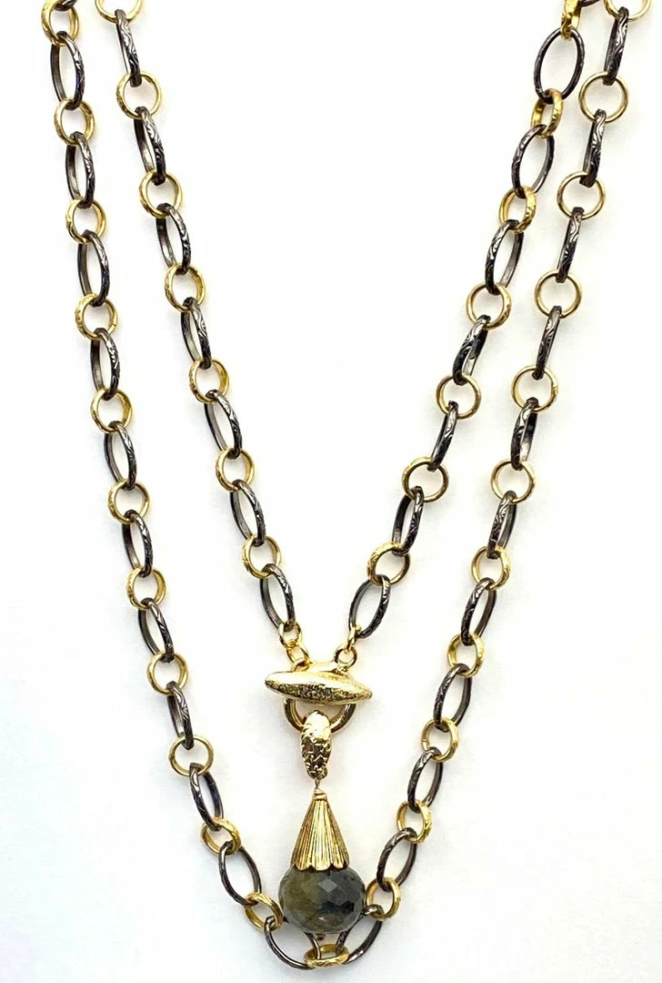 Mixed metals 14k gold plated and sterling silver black rhodium finish links with 14k gold plated enhancer, toggle and hat with faceted labradorite gemstone. Easily remove the drop to pair with other pieces in your jewelry collection. 35 1/2”