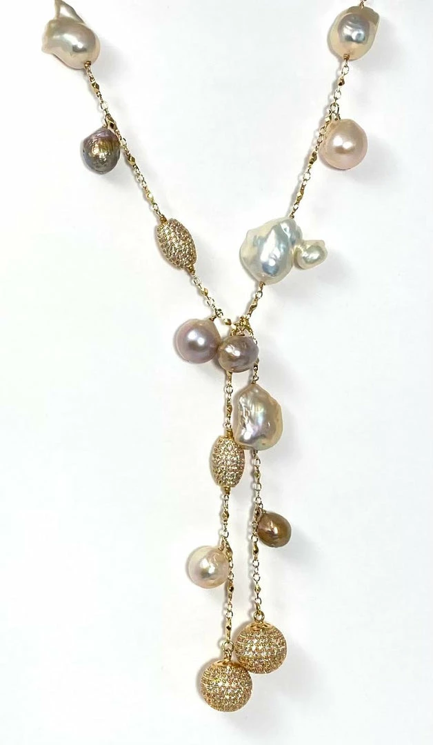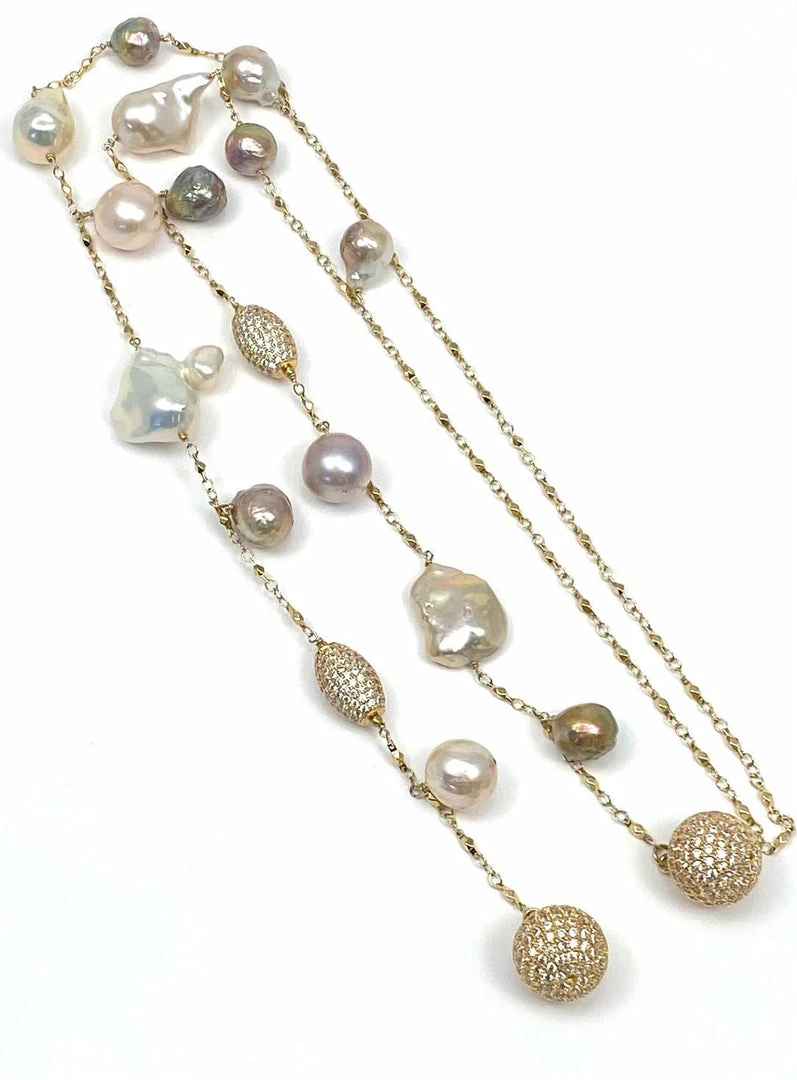 14k gold plated fine chain with beautiful multi colored baroque pearls, gold fresh water pearls and sparkling gold and cubic zirconia components. 38”