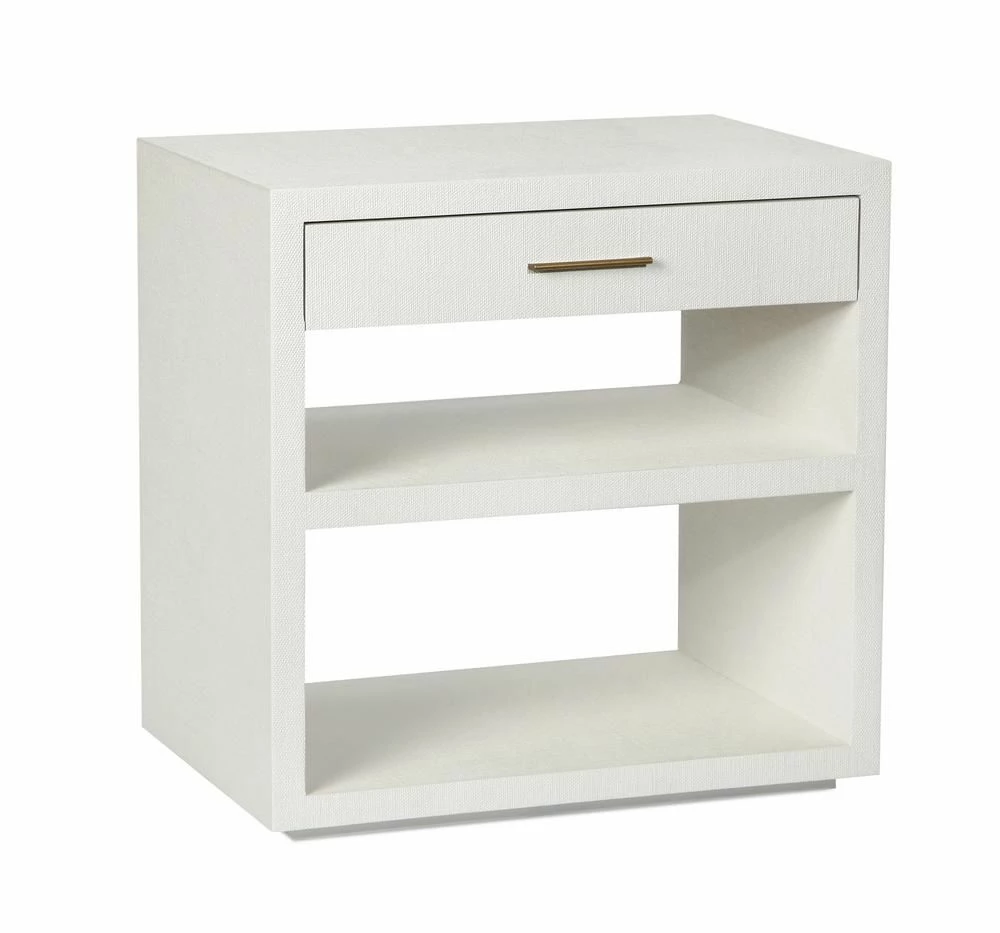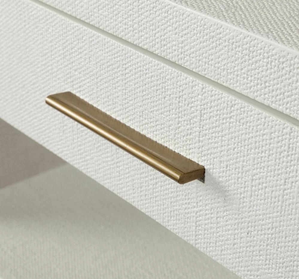 A practical bedside chest manages to retain its chic style when it’s created from white hand cast faux linen and antique brass-finished metal.