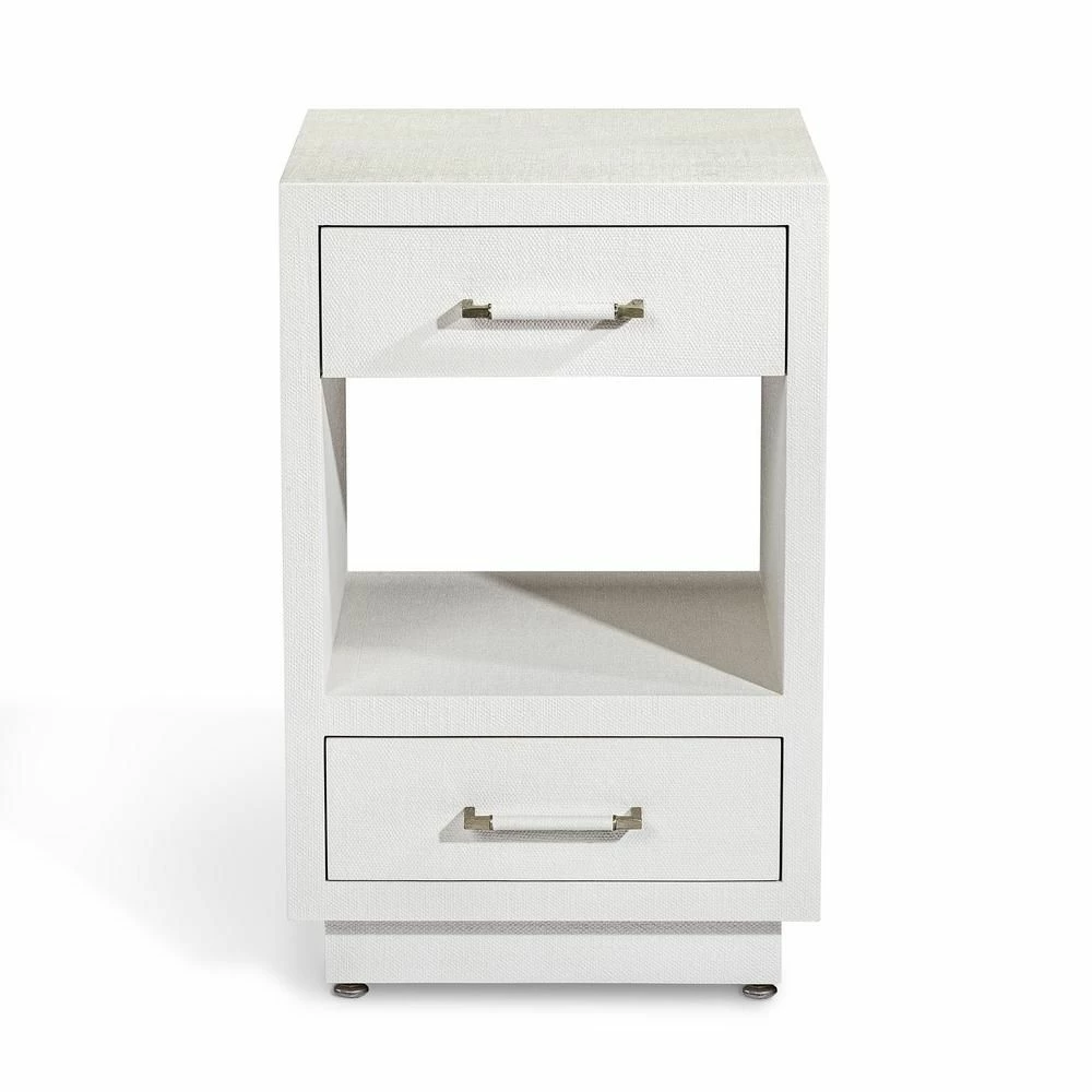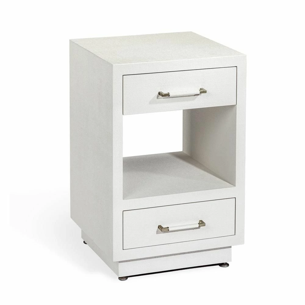 The clean lines of this Small Bedside Chest are transformed into a statement piece thanks to a surface of natural white faux linen and metal pulls in champagne silver.