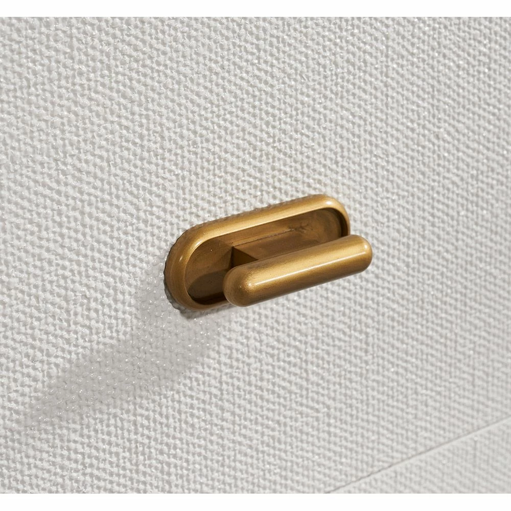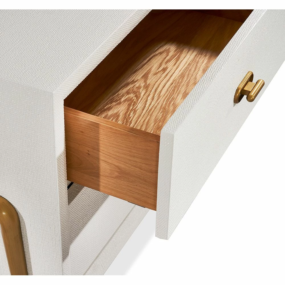 A chic metal frame in an antique brass finish pairs with a faux linen surface in natural white to transform the Mila Bedside Chest into a stunning storage piece.