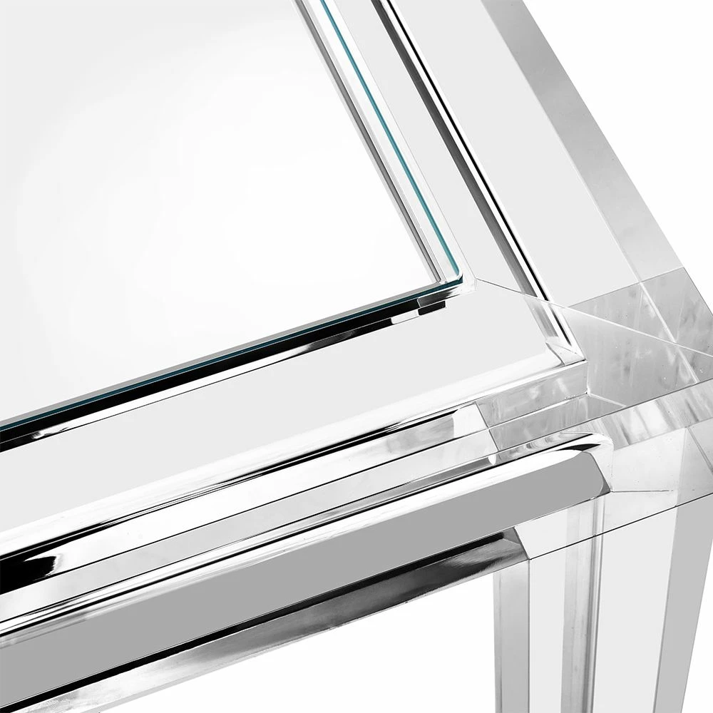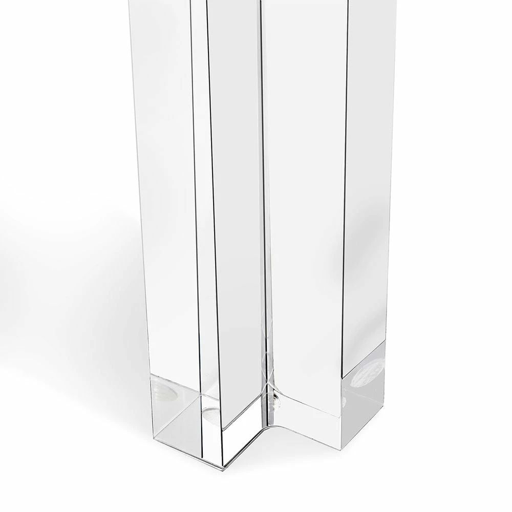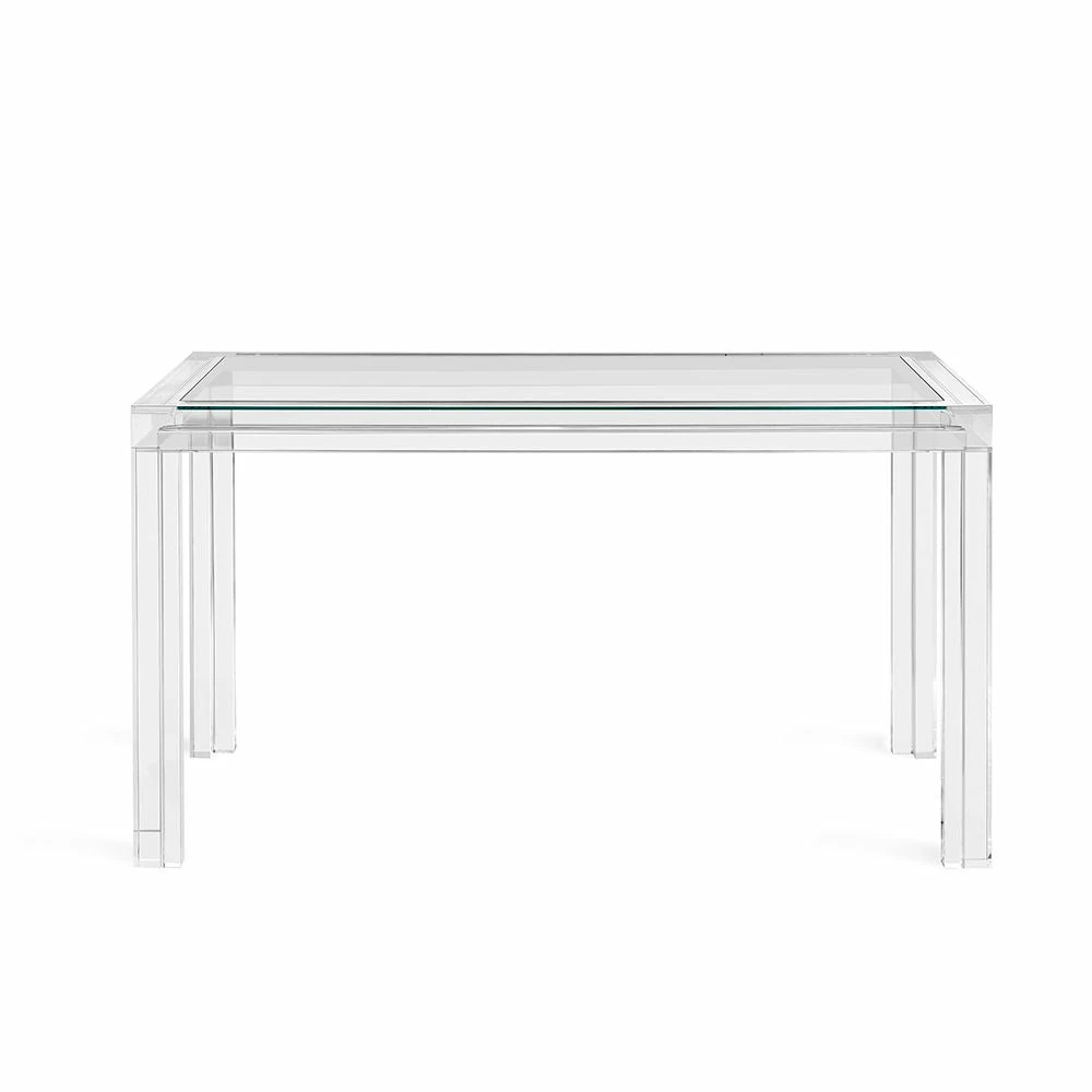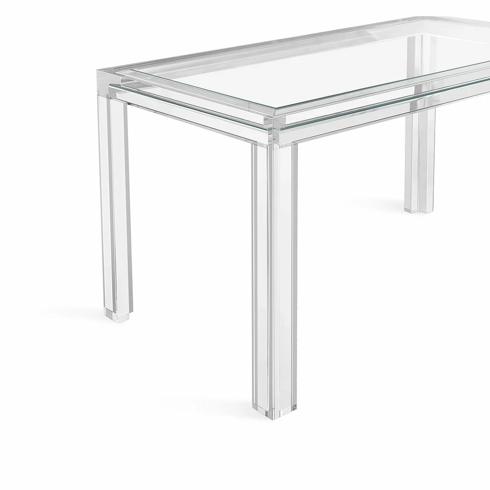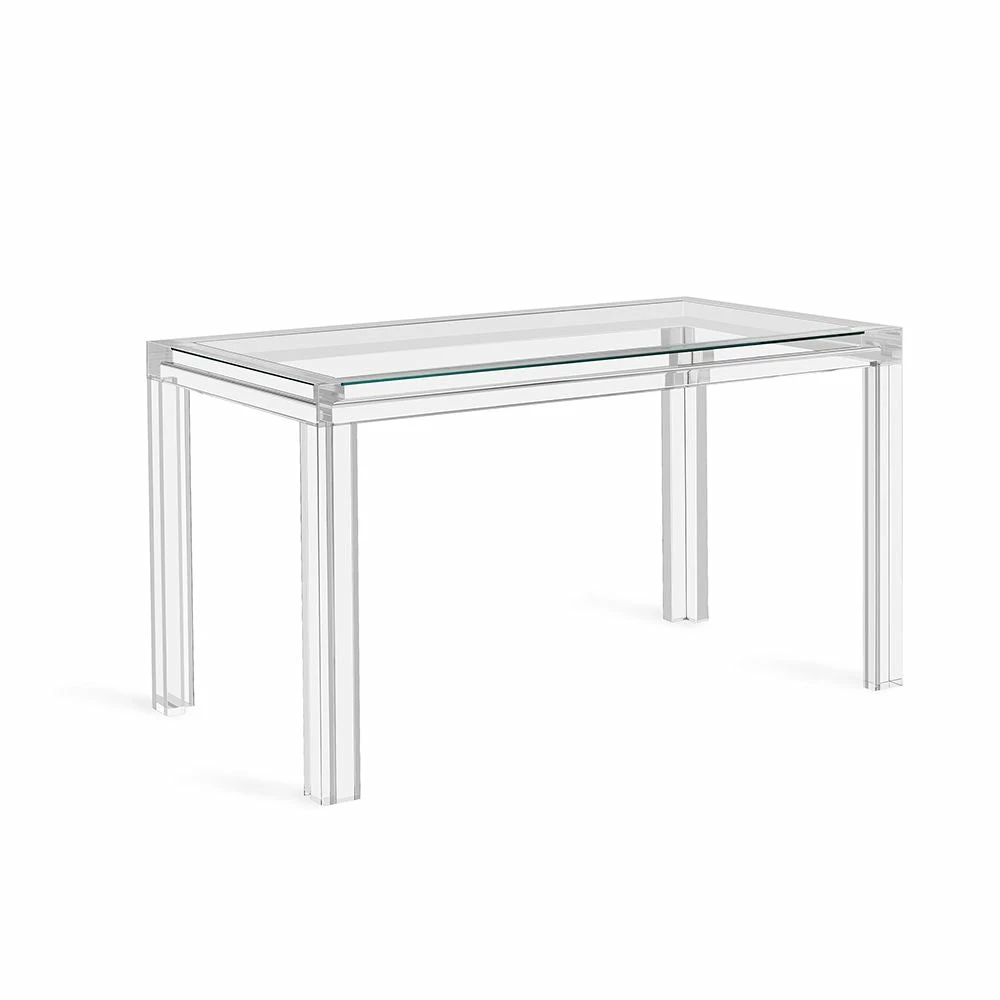 Clear acrylic and crystal glass transform this desk into an of-the-moment statement. Intricate channeling along the legs and apron elevate this classic Parsons table silhouette.