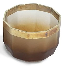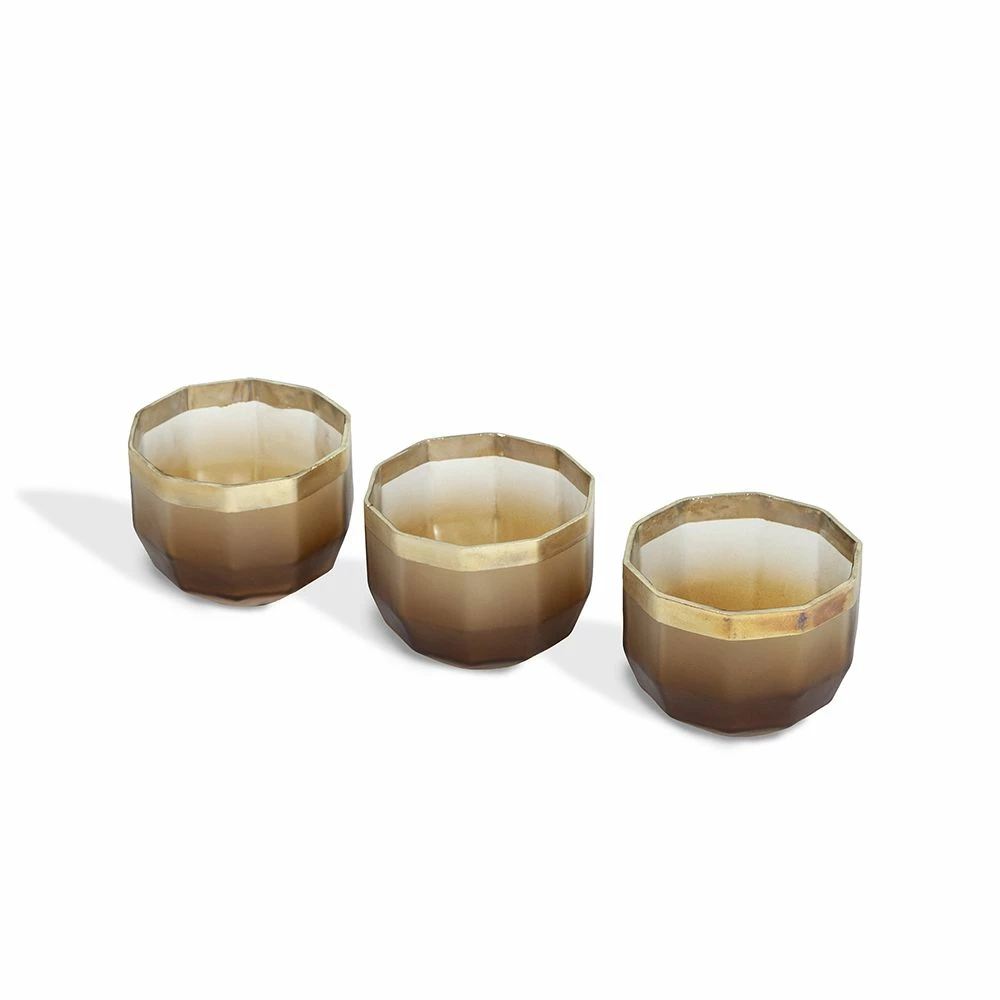 A modern decagon silhouette brings a classical feel to this trio of eclipse and champagne silver-tinted glass votives.