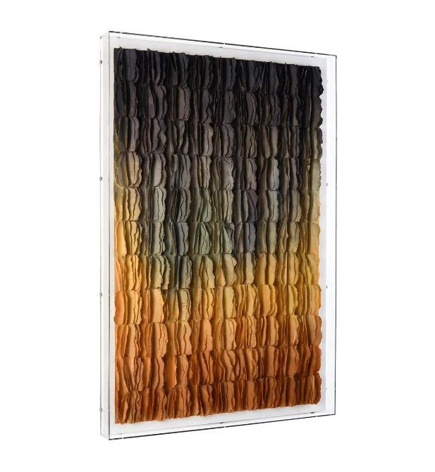 This colorful piece by Tony Fey displays a playful serenity in blue, green, and yellow tones. The art is framed in an acrylic box.