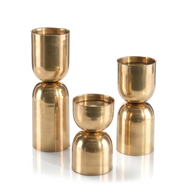 A tapered set of three hourglass candleholders in antique brass. Candles not included.