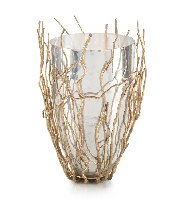The fluidity and movement of sprouting brass saplings encase a silvered vase. The reflection of each branch adds depth to this wonderful piece.