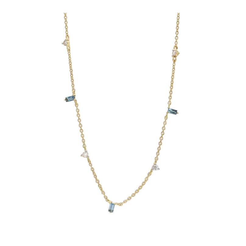 From the Jude Frances Lisse Collection, the Lisse Floating Cluster Necklace features London blue topaz stones and white diamonds set on an 18K yellow gold chain.