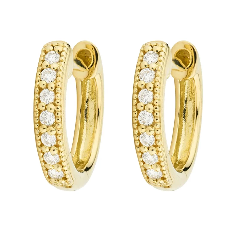The Small Diamond Huggie Hoop Earrings feature sparkling round diamonds pave set in 18K yellow gold.