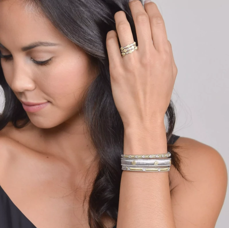 From the Mixed Metal Collection, the Mixed Metal Double Quad Stacker Ring features bezel set diamond quads set in 18K yellow gold with gold beads on a sterling silver stacker ring with the signature brushed JFJ finish.