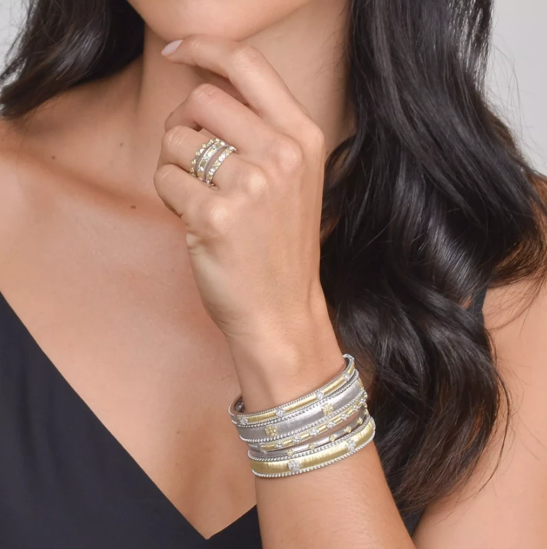 From the Mixed Metal Collection, the Mixed Metal Thin Diamond Kite Stacker Ring features diamond kites set in 18K yellow gold on a sterling silver stacker ring with the signature brushed JFJ finish.