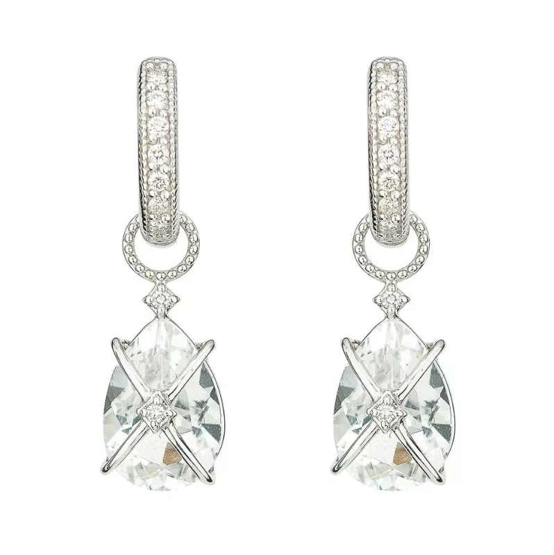 From the Lisse Collection, the Tiny Criss Cross Wrapped Pear Stone Earring Charms feature pear shaped stones wrapped in 18K gold with simple diamond accents. Hoops and earring charms sold separately.