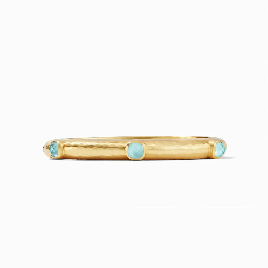 Lightly hammered bangle showcasing six stations of rose cut imported glass with mother of pearl doublet.