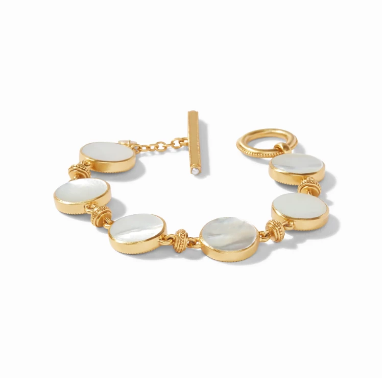 Reversible bracelet featuring gemstones and gold coins with a toggle closure.
