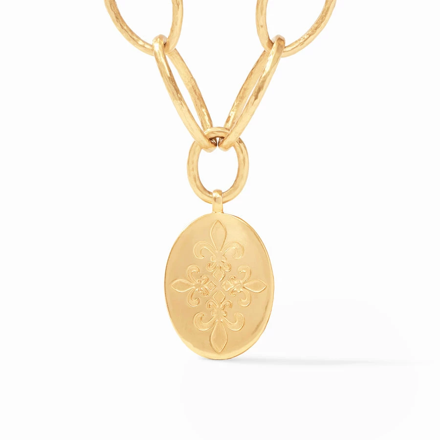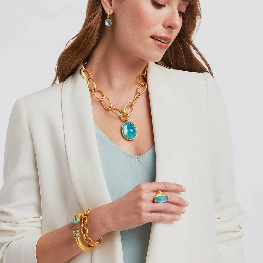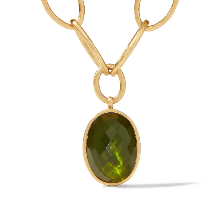 Statement size oval rose cut jewel suspended from a shimmering hammered link with a toggle closure.