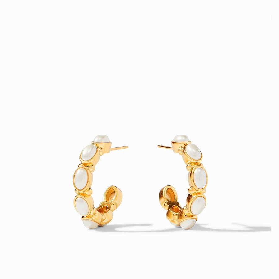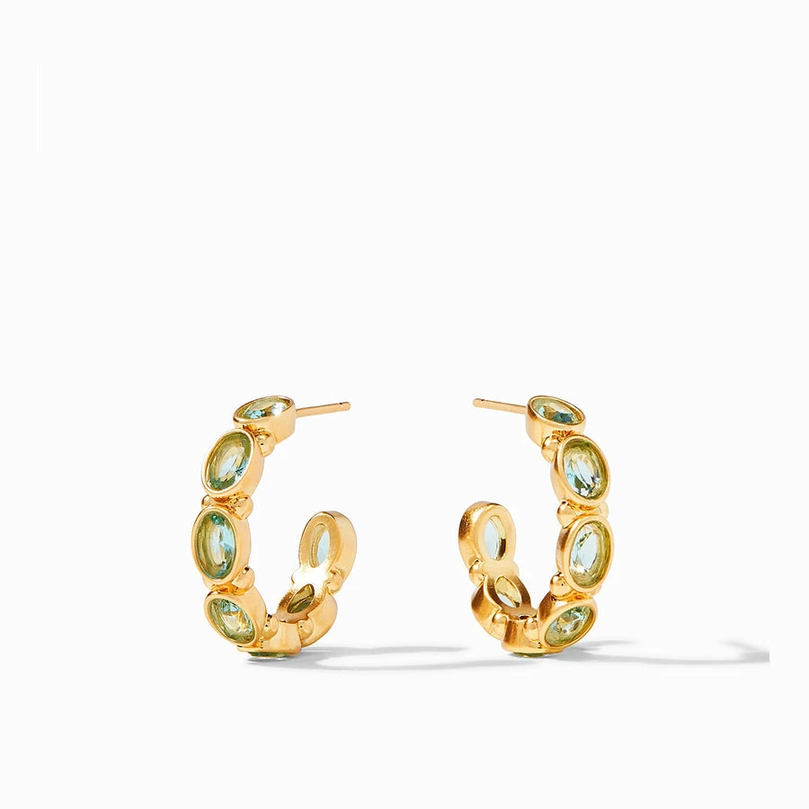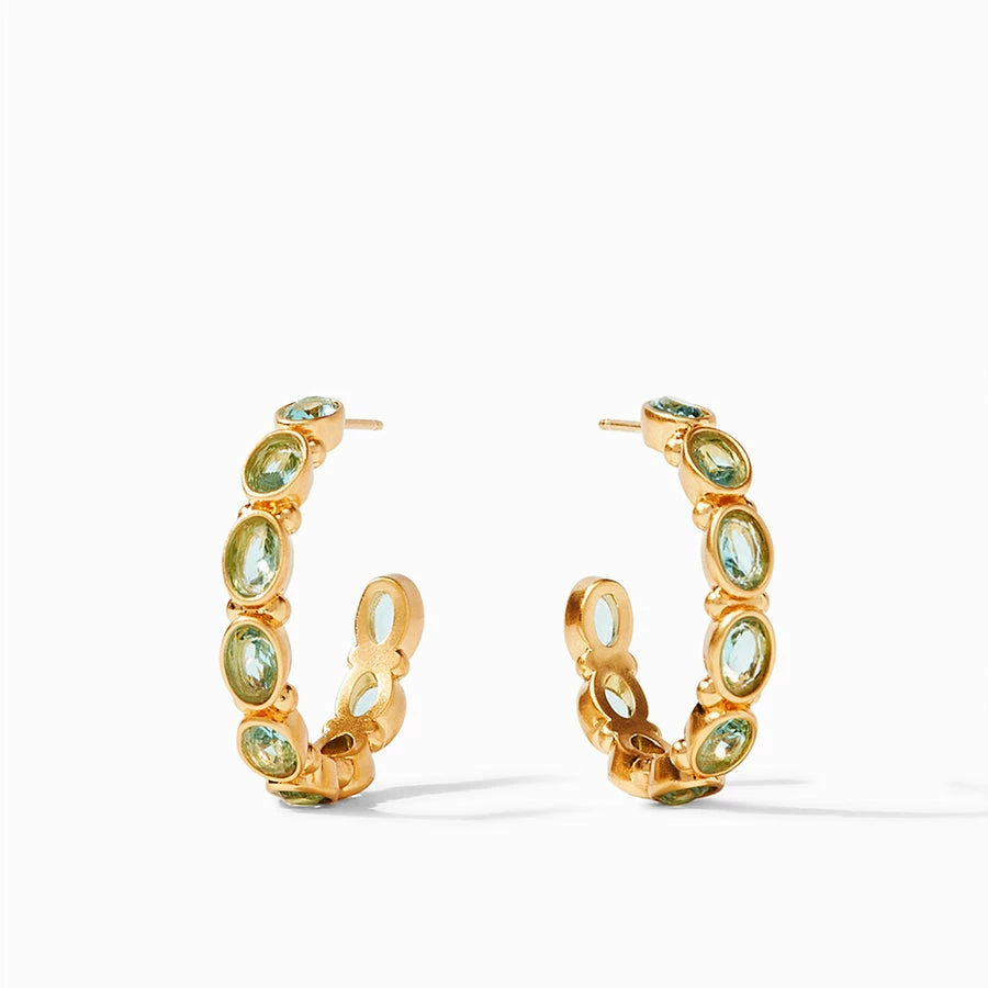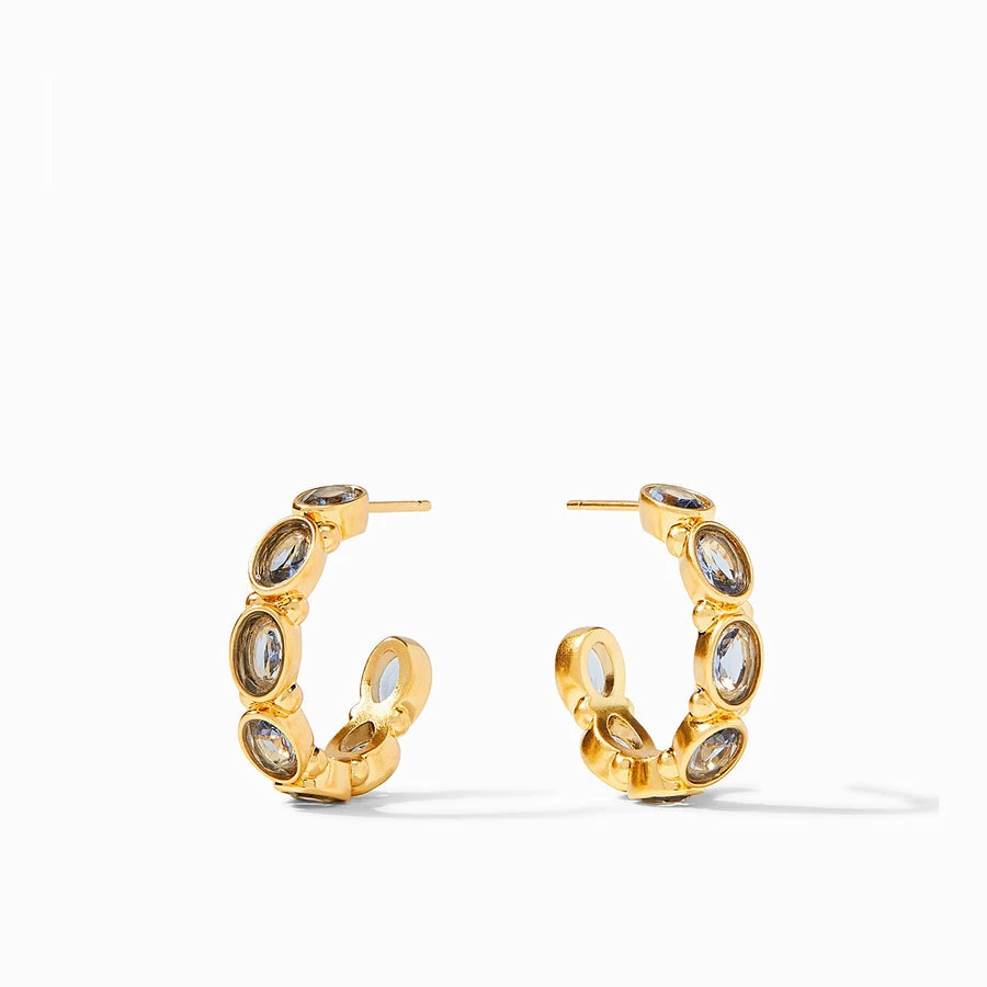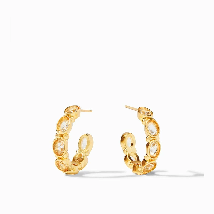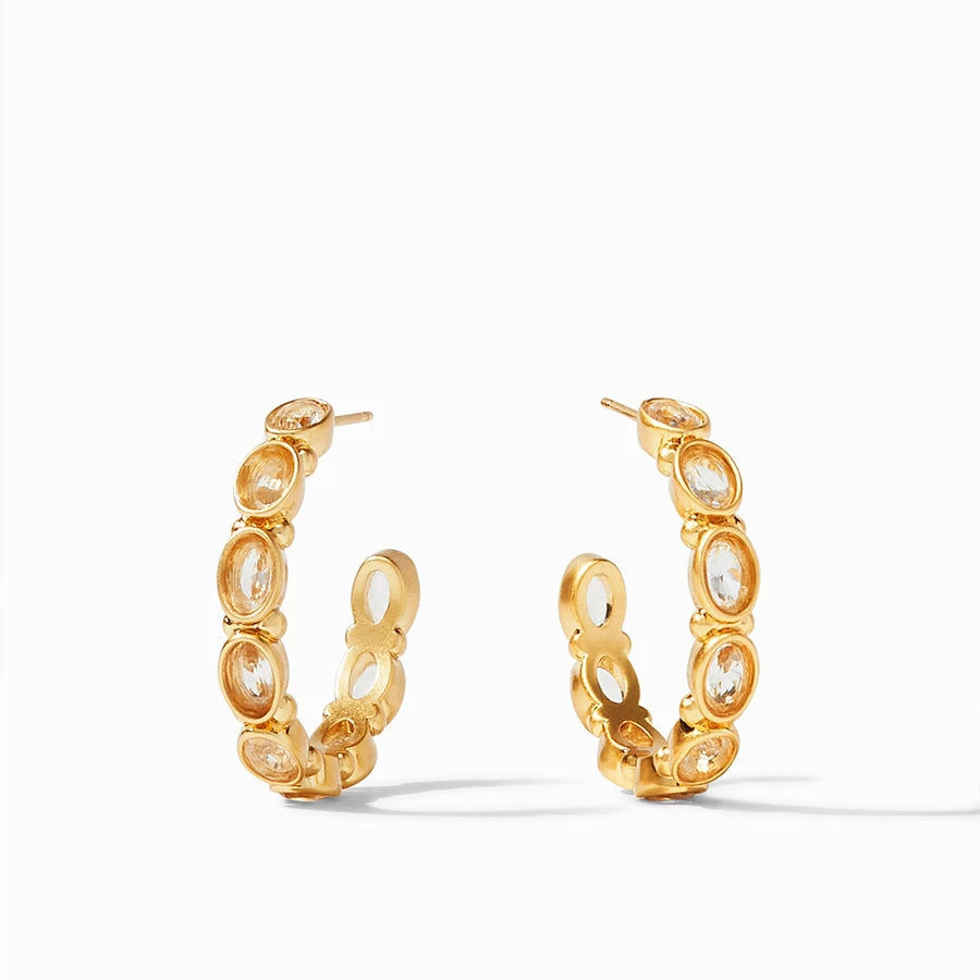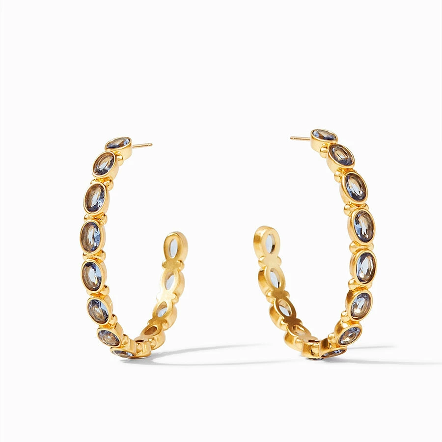 Hoop earring decorated with sparkling oval facets nestled in a gilded surround.