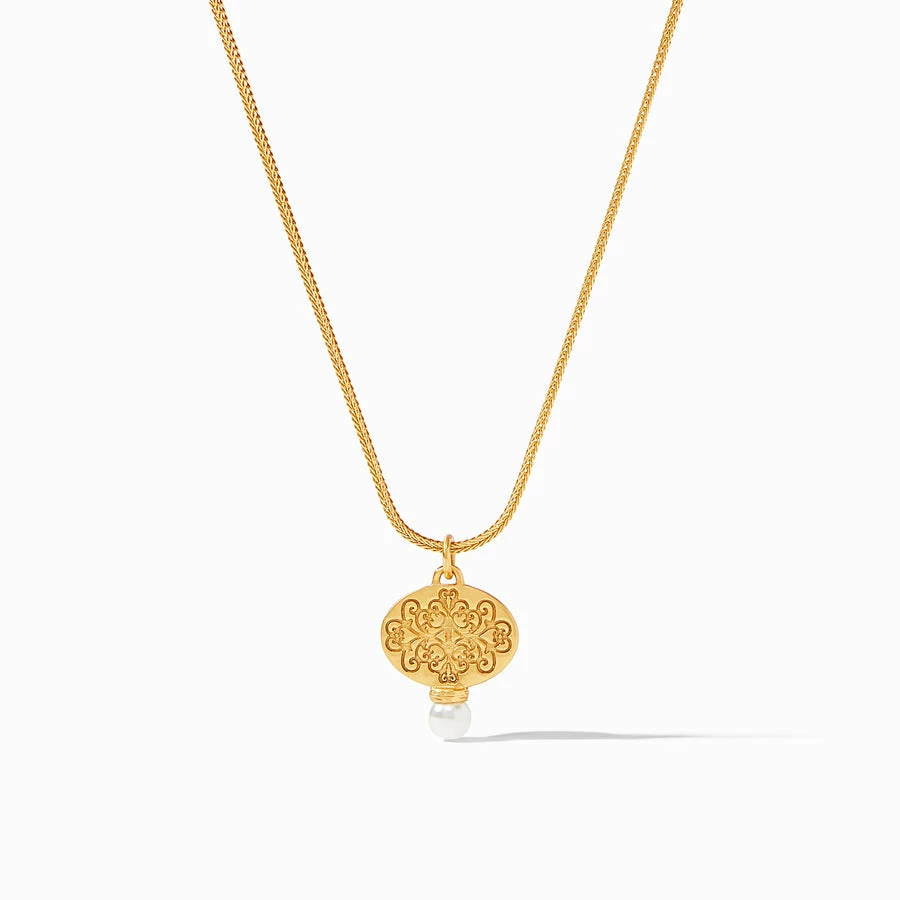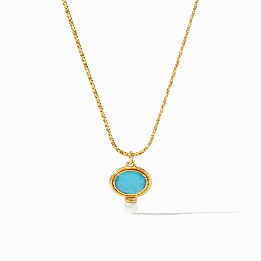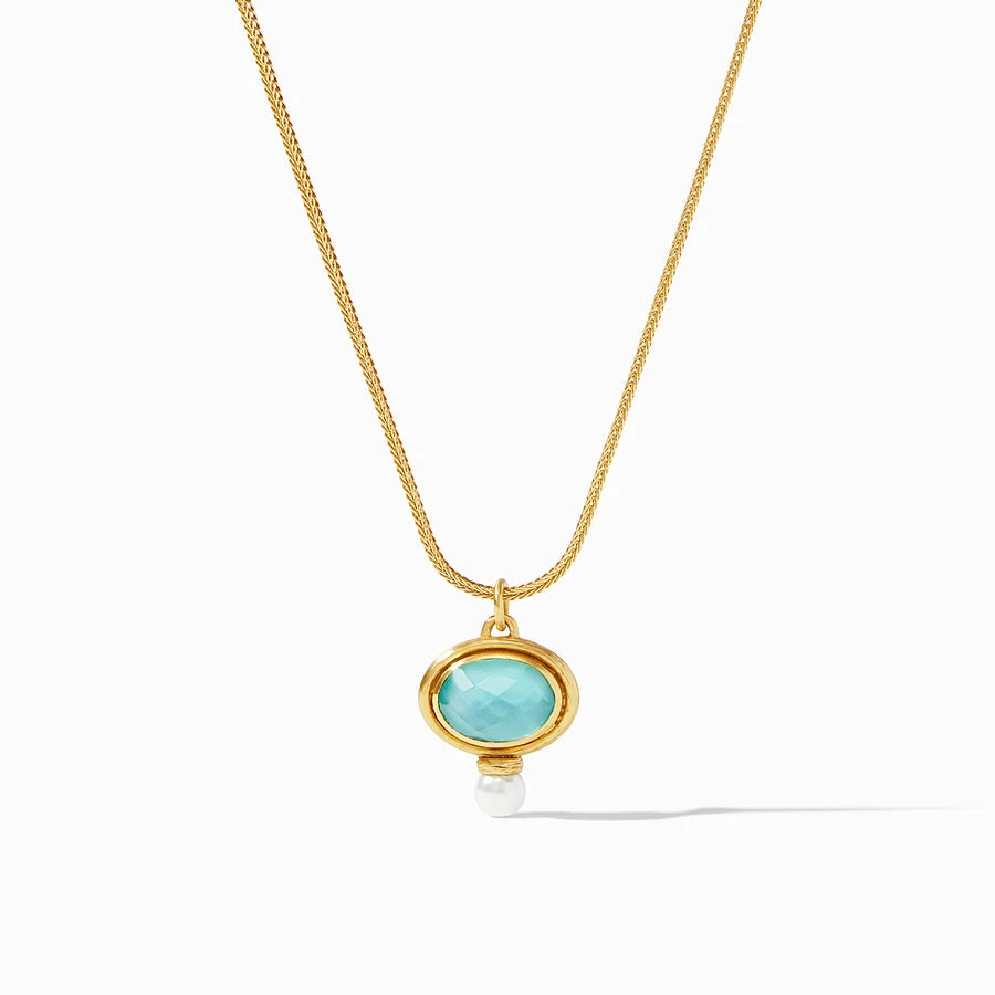 Radiant, rose-cut oval gemstone of imported glass and mother of pearl in gilded surround suspended from a delicate chain.