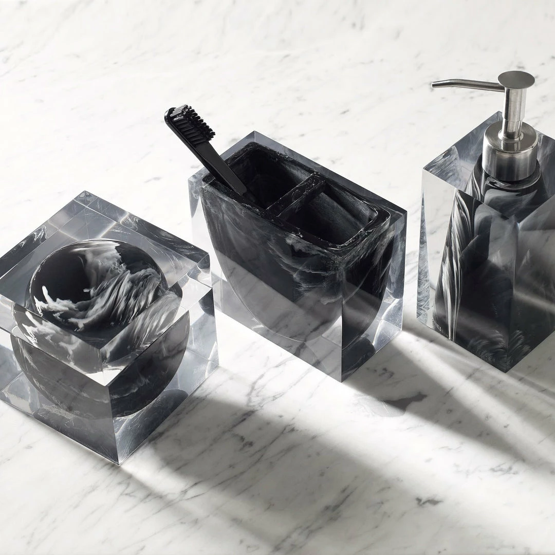 Adorn your spa with these bath accessories. Crafted with ink-injected resin that floats seamlessly in a translucent acrylic encasing, these accessories complete a bathroom that radiates with textural and modern appeal.