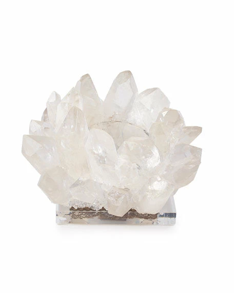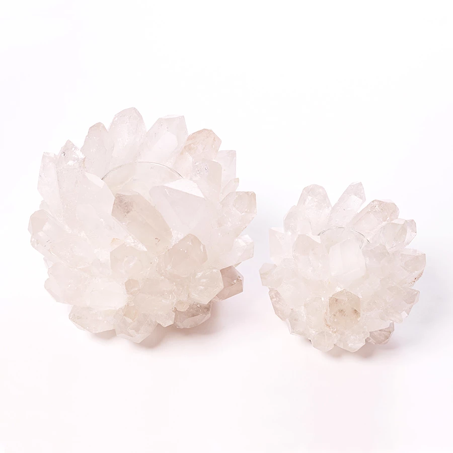Handcrafted votive holder made of quartz and glass. When a candle is added, the votive gives off a warm, glowly light, shining through the quartz. Since each votive is handmade, variations in size and shape are part of this item’s uniquity. (Candle not included).