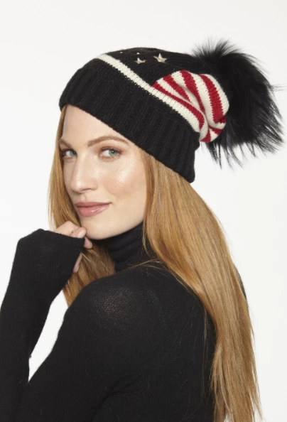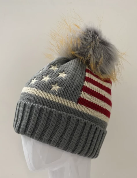 American Flag, Stars and Stripes Hat with Genuine Fur Pom Pom. Available in Black and Grey.