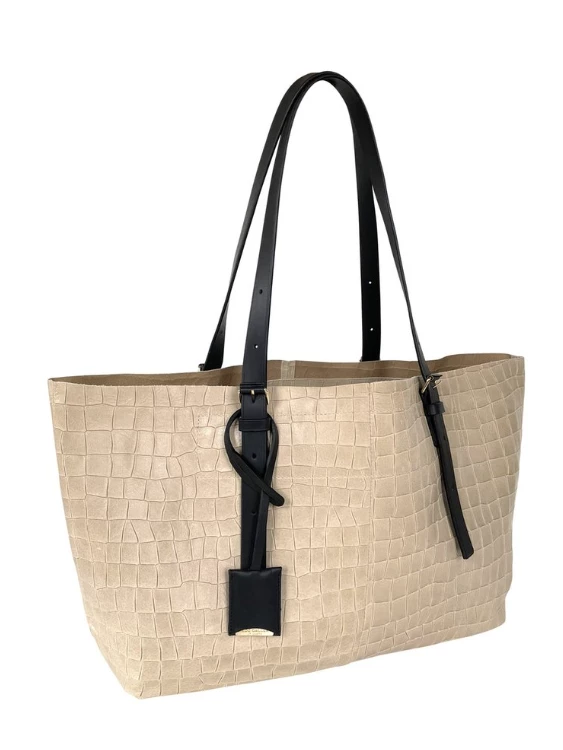 Calf leather, ‘alligator’ embossed, non-lined, the reverse side of the leather has been treated with a light resin.