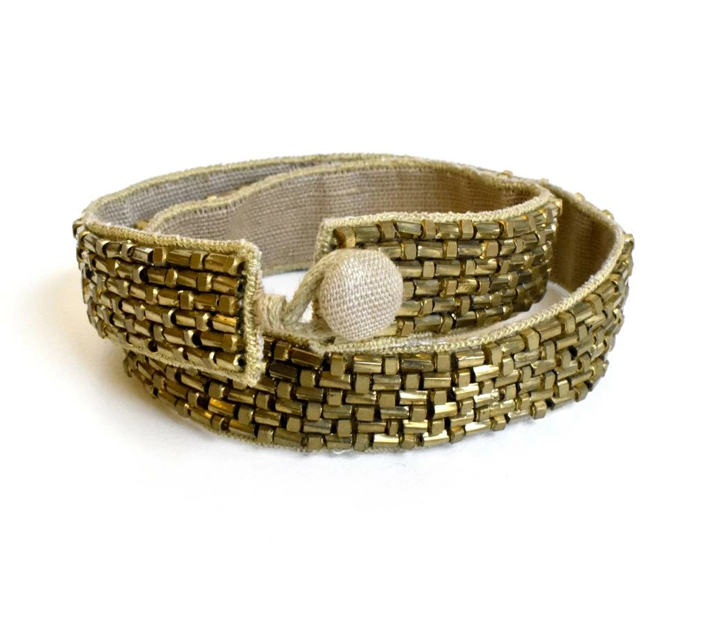 A glint of burnished gold shimmers from this twice wrapped bracelet that is sealed with a button and loop. Rows of tightly packed beads are attached to a cloth base and create a surface that is both consistent and irregular.