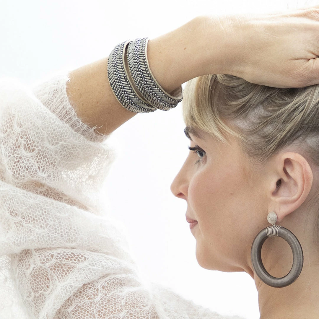 Rows of linear beads catch the light in this double wrap bracelet that is sealed with a button and loop. Stitched by hand to a cloth base, a rounded center falls away into angled edges.