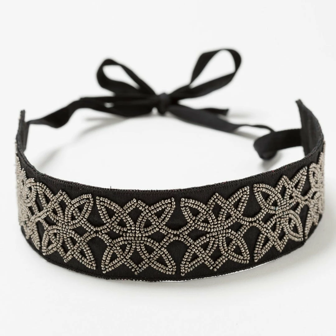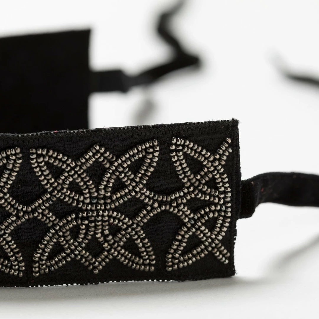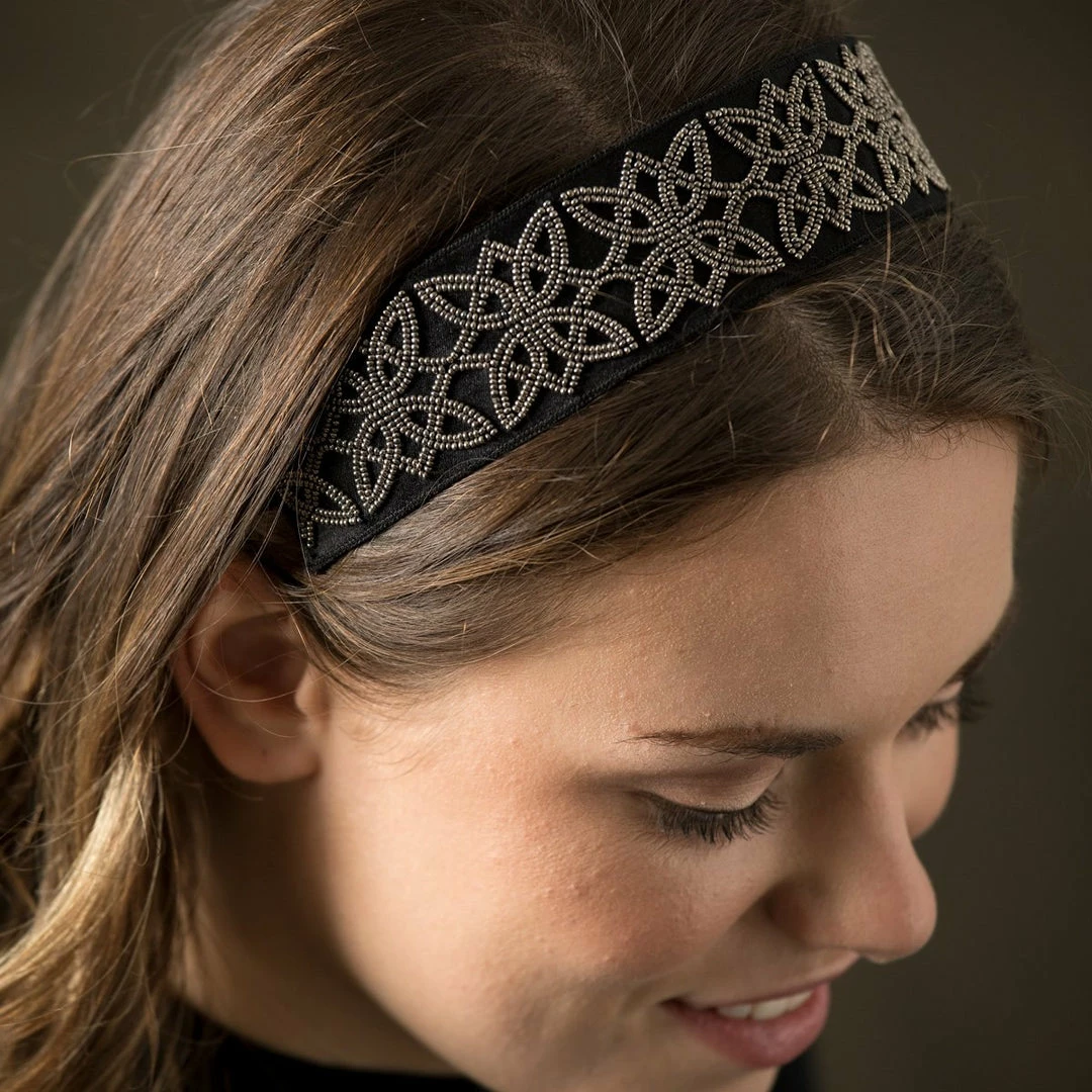 Tie back your hair and celebrate with this sophisticated headband. A metallic labyrinth motif is created by seed beads hand sewn to a base of satin and black suede.