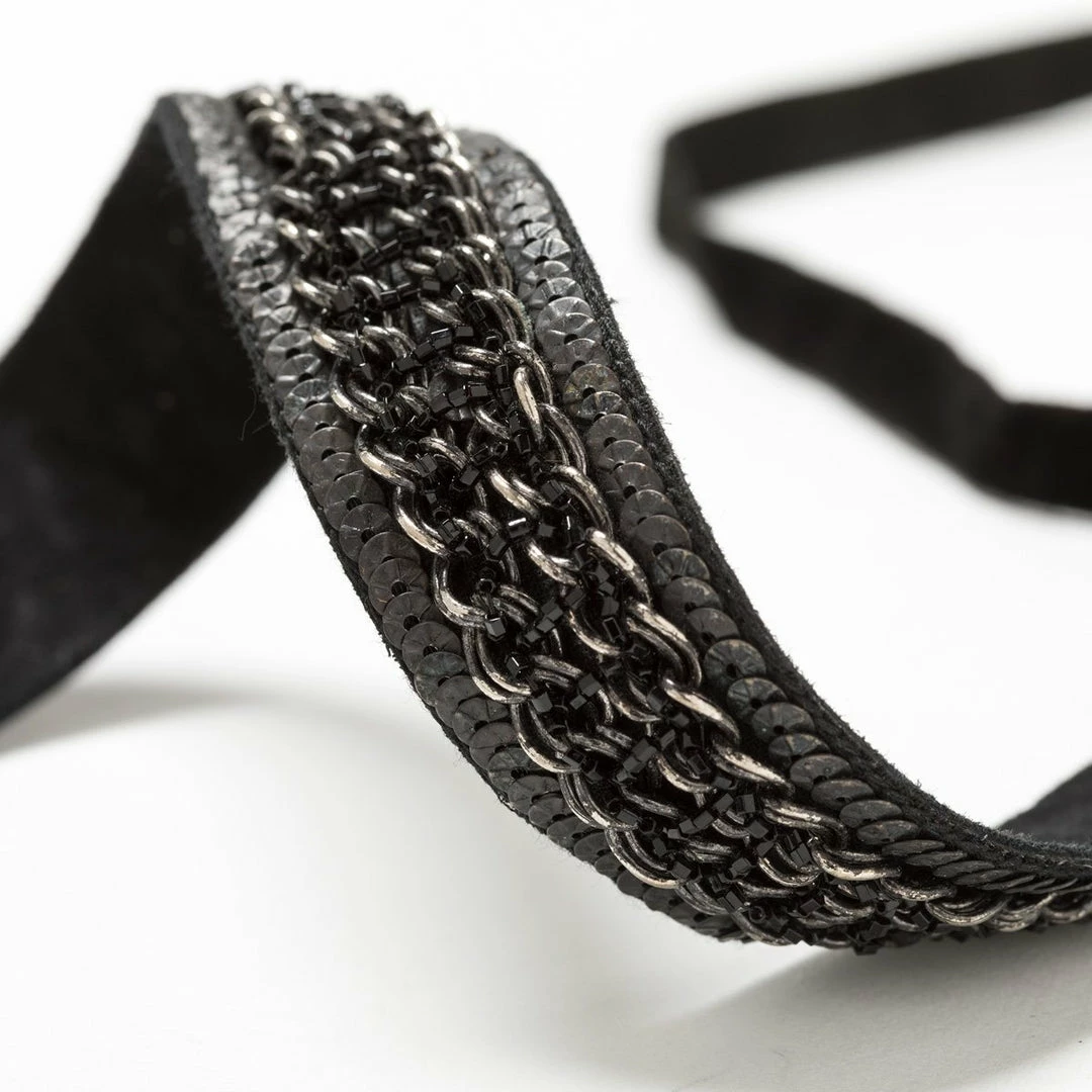 This elegant choker combines chain, sequins and beads in a structured, intricate surface. Backed with soft suede, and velvet ribbons extend for easy fastening.
