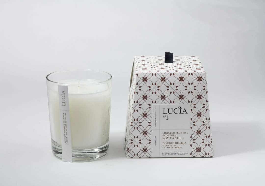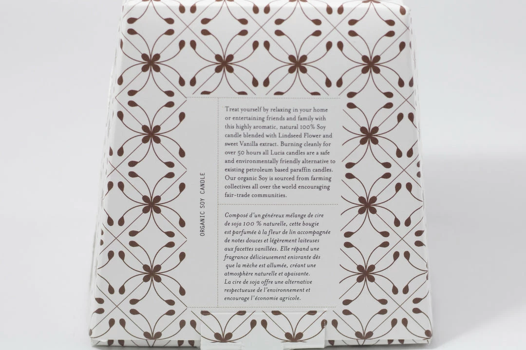 Treat yourself by relaxing in your home or entertaining friends and family with this highly aromatic, natural 100% Soy candle blended with Lindseed Flower and sweet Vanilla extract. Burning cleanly for over 50 hours all Lucia candles are a safe and environmentally friendly alternative to existing petroleum based paraffin candles. Our organic Soy is sourced from farming collectives all over the world encouraging fair-trade communities.Â