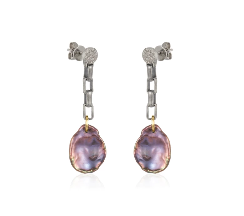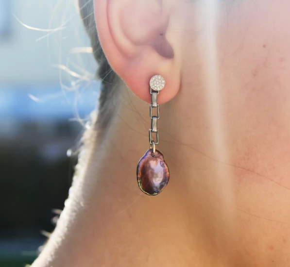 Elongated oxidized sterling silver chain drop with peacock color keshi pearl on removable sterling silver pavé diamond posts. Diamond posts are rhodium plated.