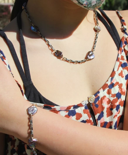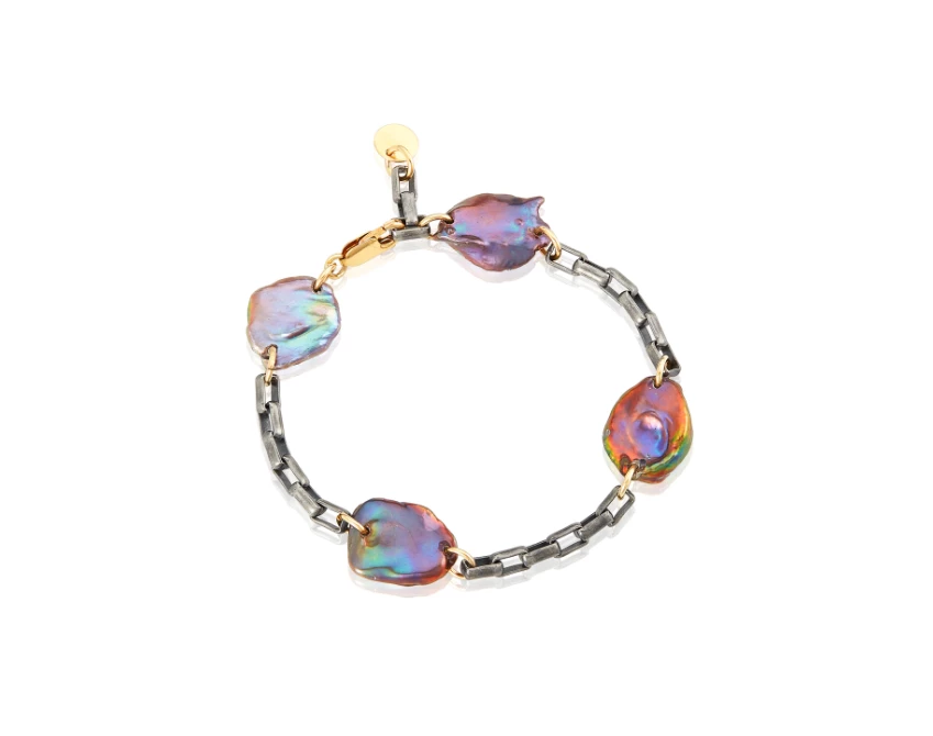 Elongated heavy oxidized sterling silver chain bracelet with luster unique peacock color keshi pearls.