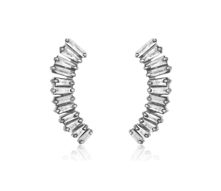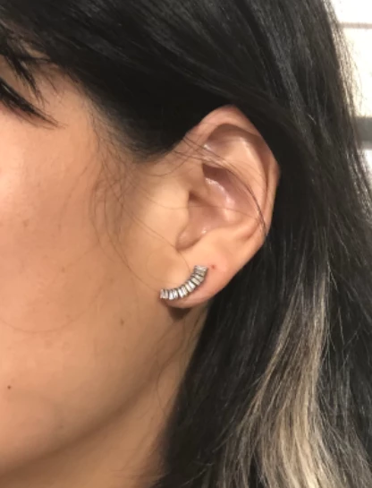 Baguette diamonds stacked on top of each other to create a half circle, set in sterling silver, on sterling silver posts.Â