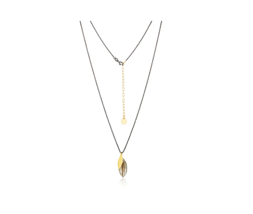 Laser cut oxidized sterling silver chain with 14k gold-plated leaf charm pendent attached with a rose cut labradorite.