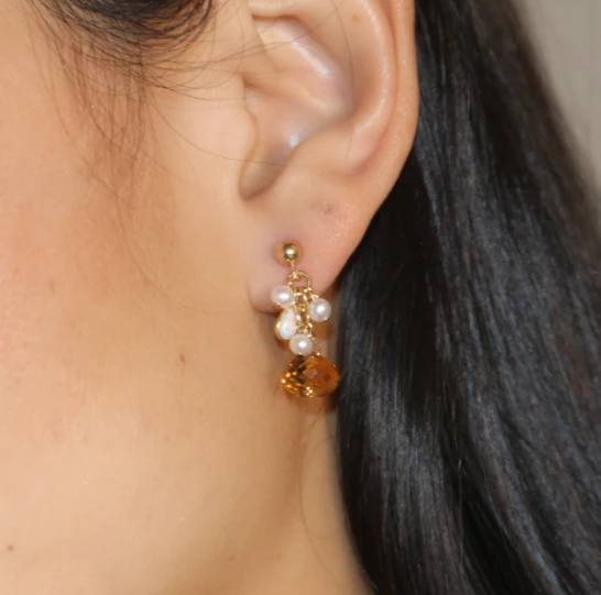 Clusters of gold-plated bezeled opals with tiny pearl beads above beautiful dark yellow citrine drops on gold-filled posts.