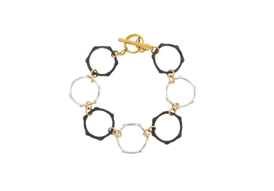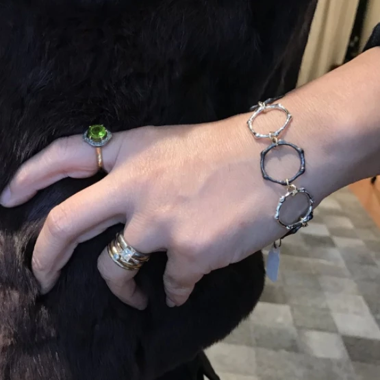 This cool piece pairs perfectly with Mabels’ Modern Bamboo Bangle. Oxidized silver and silver bamboo round hoops.