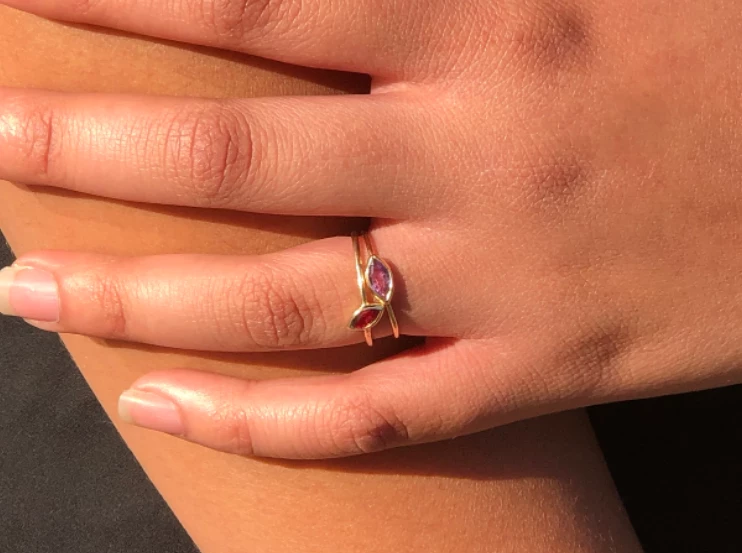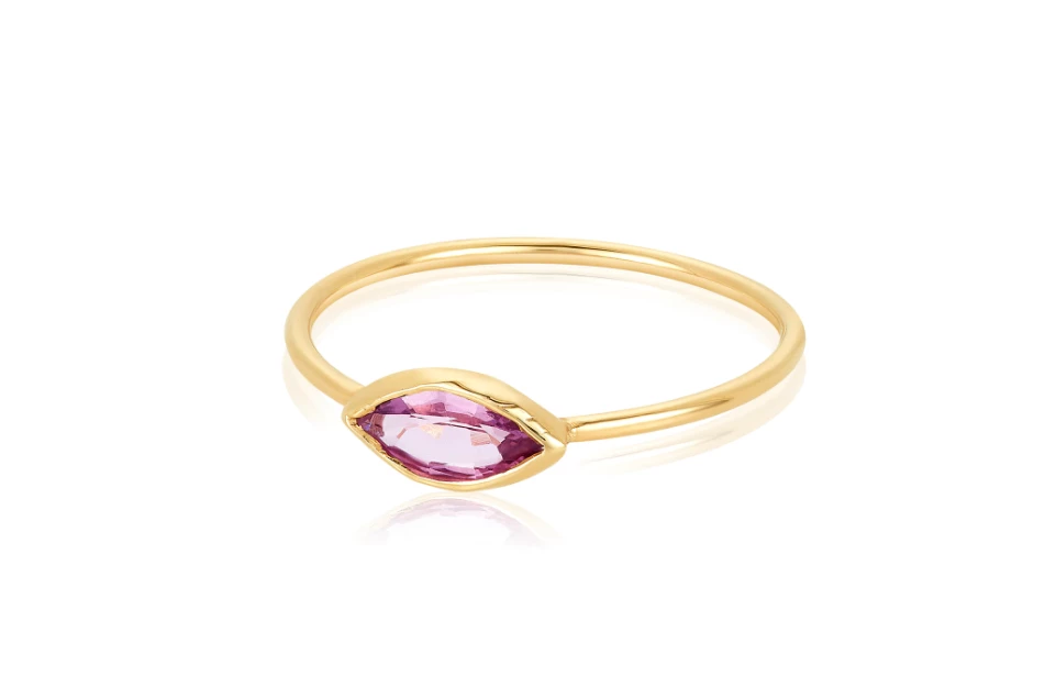 A horizontal marquise cut pink sapphire in a 14k gold bezel setting on a thin band.