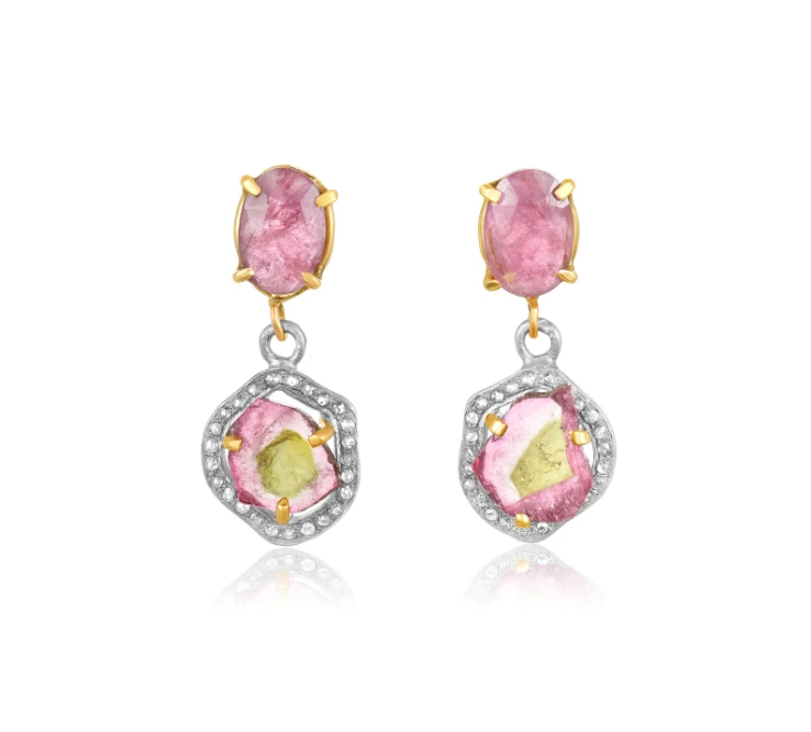Watermelon Tourmaline set on pave diamond halo hung on oval tourmaline post.