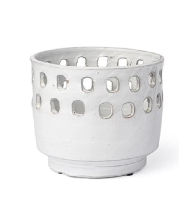 This ceramic vase is finished in a rustic white tone with hollowed-square patterns.Â