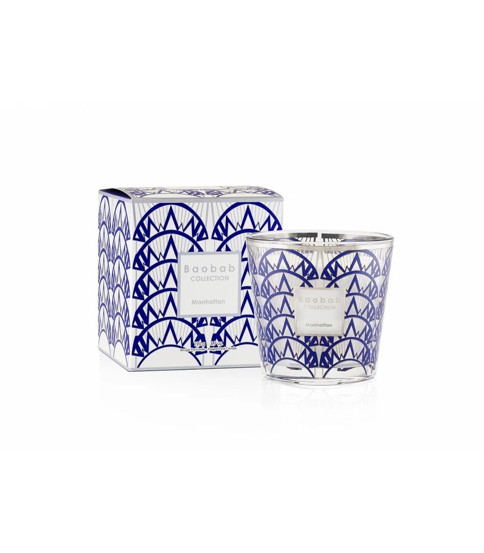The Manhattan scented candle is poured in a glass that bears a platinum and navy blue screen-printed design inspired by the art deco architecture of the Chrysler building.