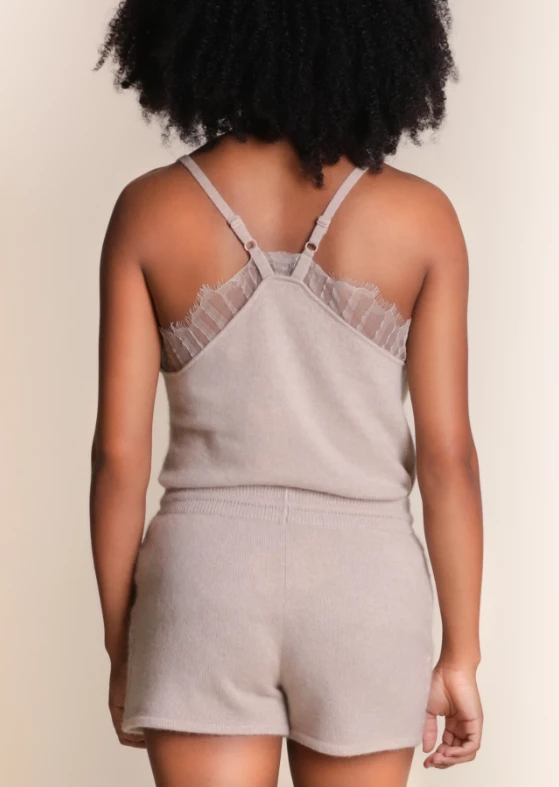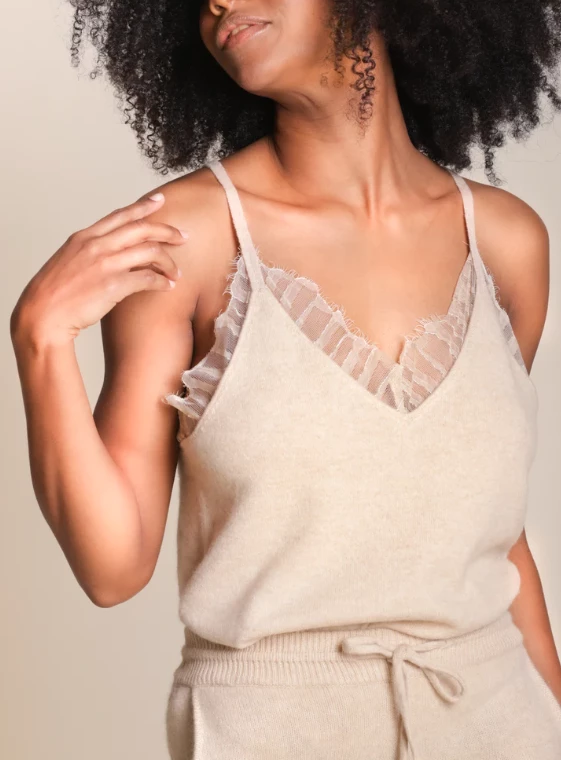 If you were looking for the easiest and most luxurious camisole your search is finally over. The EM camisole is a stunning combination of finely knitted cashmere and delicate but cool scallop lace detailing. We love how the lace along the neckline elevates this everyday luxury basic. Layer under your NEEDLE & PINE cashmere cardigan or with an oversized blazer to give you that cool girl je ne sais quoi.