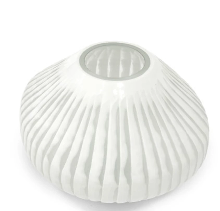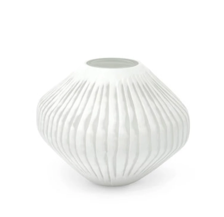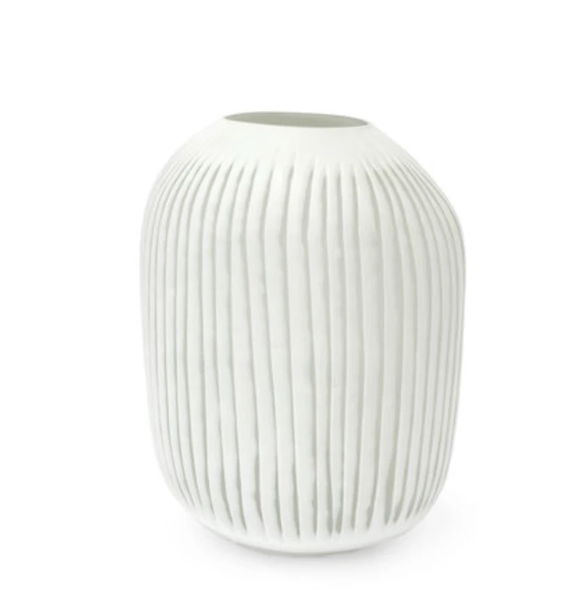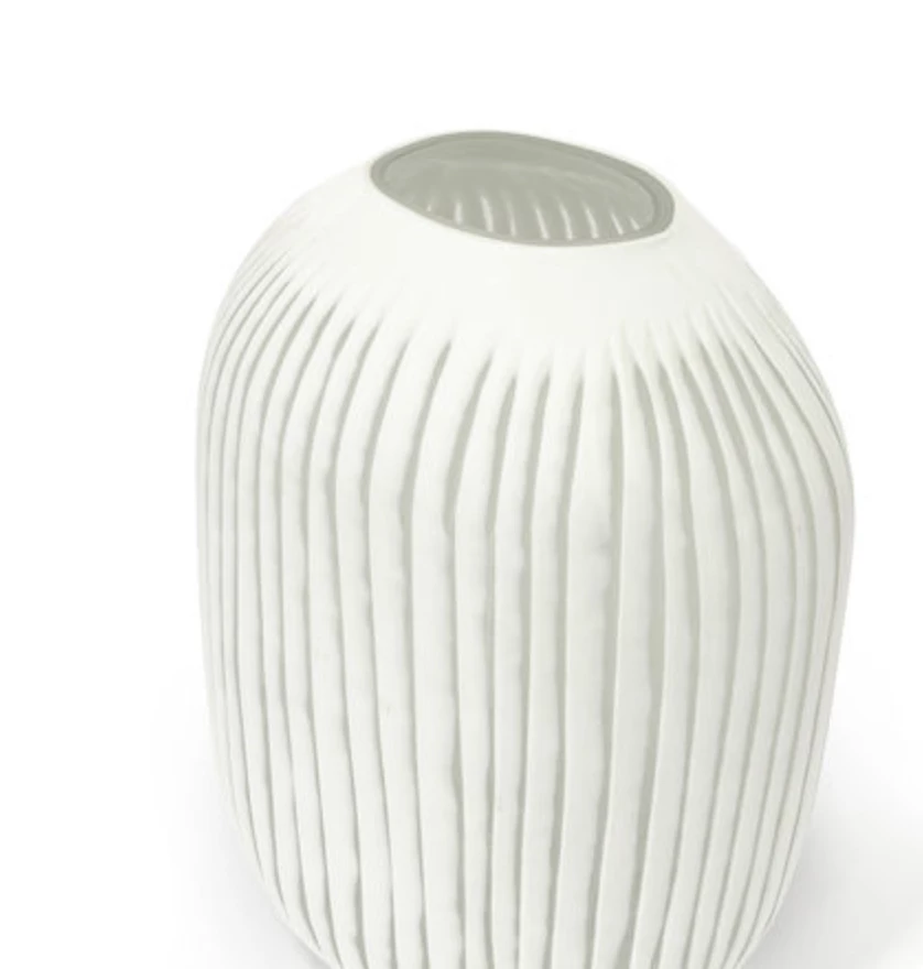 White glass vase with vertical carved stripes.