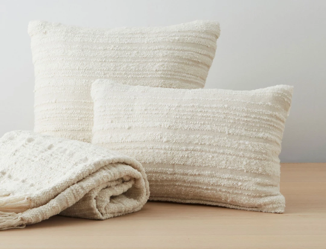 The organic stripes of our llama and merino boucle pillow were created by hand weaving two wools of contrasting thickness. Pillows are sold with down inserts. Â