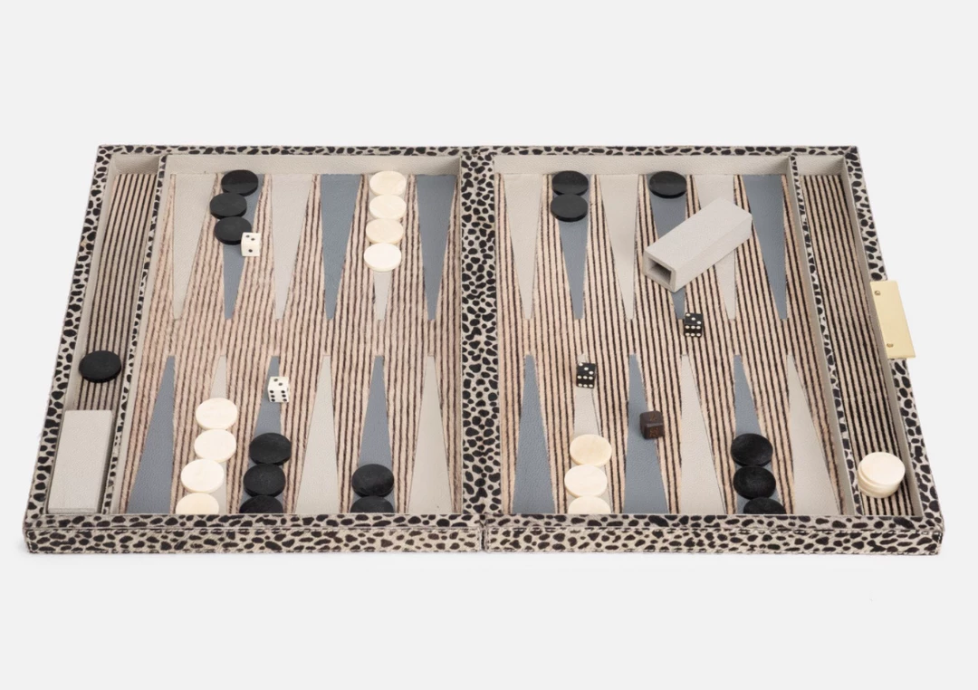 Luxury backgammon sets in trendy hair-on-hide prints. Full-grain leather inside. Game pieces are horn and bone.