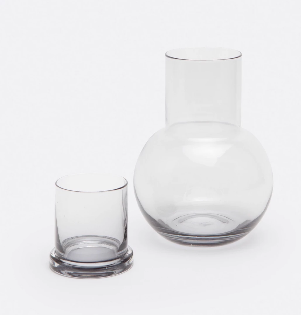 Beautiful light gray glass carafe with built-in tumbler. Perfect for your bedside table.