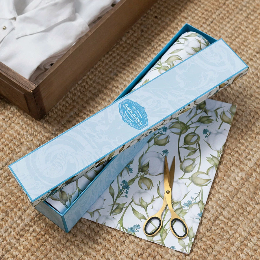 Richly decorated with gorgeous cotton flower illustrations, this Cotton Flower Drawer Lining Paper is made with an exclusive technology that ensures a long-lasting perfume. The result is a unique decorative item that softly fragrances your clothes with the delicate and pure Cotton Flower scent.