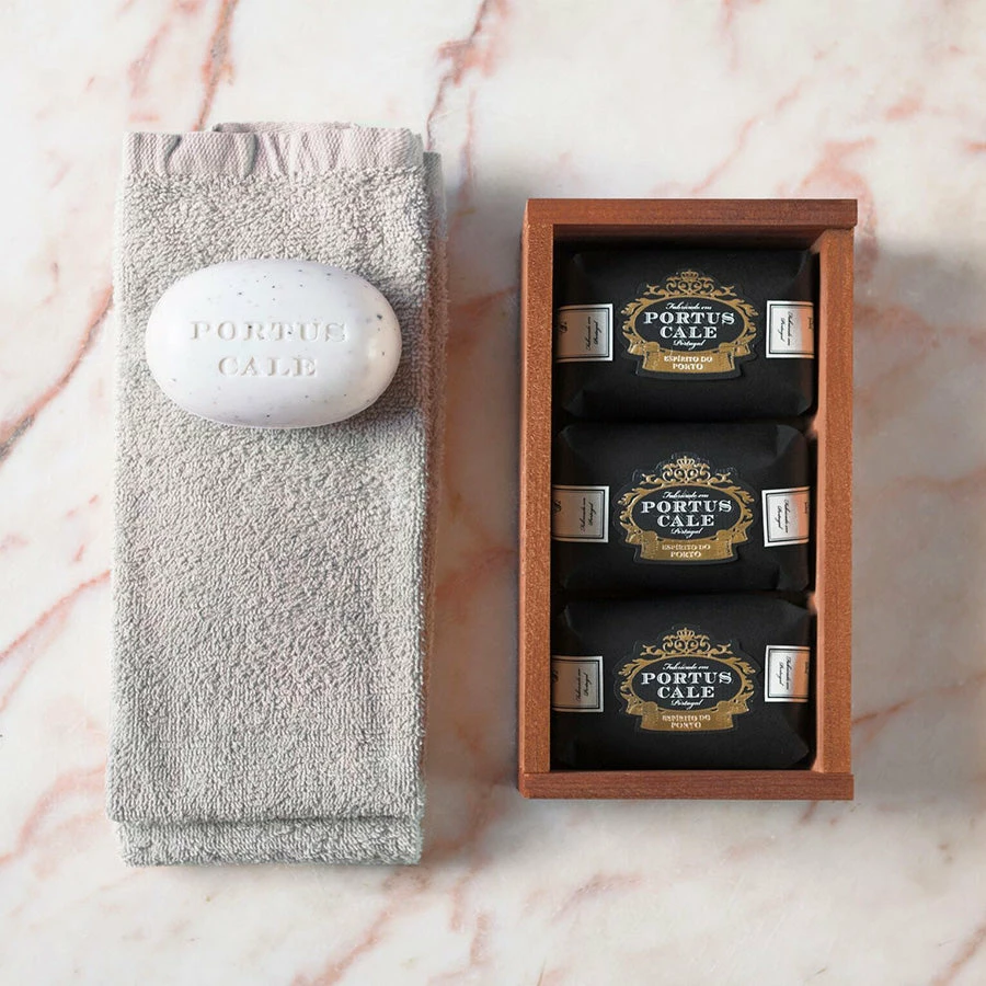 A luxurious set of three Portus Cale Portus Cale soaps, a sophisticated gift for any occasion. Hand stamped and hand wrapped by our craftswomen in black matte paper sporting golden arabesques. Each soap is made with a 100% vegetable base. With a succulent and fruity fragrance and made with grapeseed, each soap forms a luxurious and soft foam which cleanses as it gently exfoliates the skin. These soaps are packaged in luxurious burnt wood boxes.
