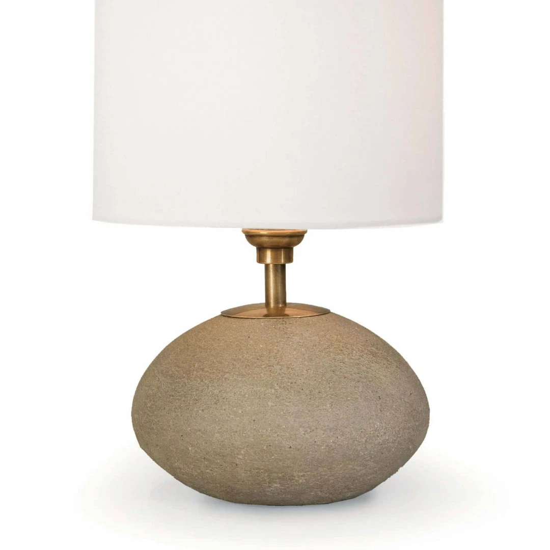 Clean lines and elemental materials lend an iconic quality to this mini lamp. Its orb profile is a timeless, classic shape that spans the centuries. Fitted with natural brass hardware, tall natural linen cylinder shade and topped with a round natural brass finial for a modern industrial look.