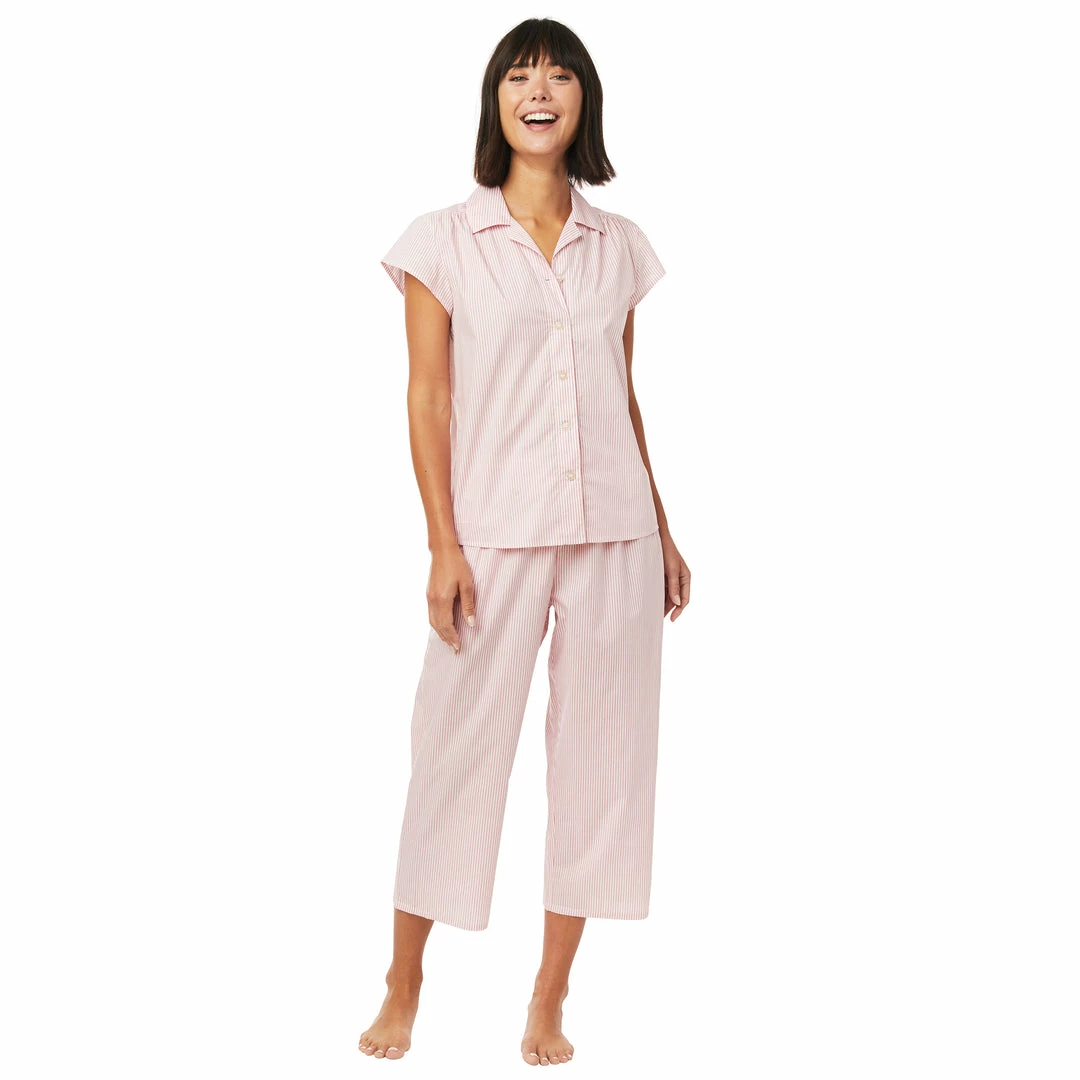 Pajama top has cap sleeves with ruching detail at the shoulder