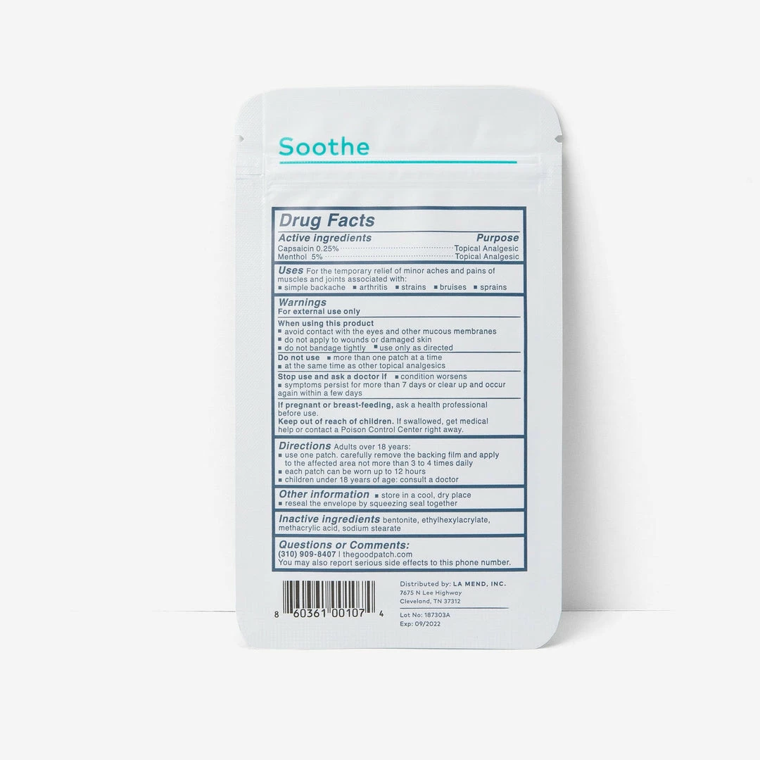 The Soothe patch provides on-the go targeted temporary relief from minor aches and pains of muscles and joints associated with simple backache, arthritis, strains, bruises and sprains.